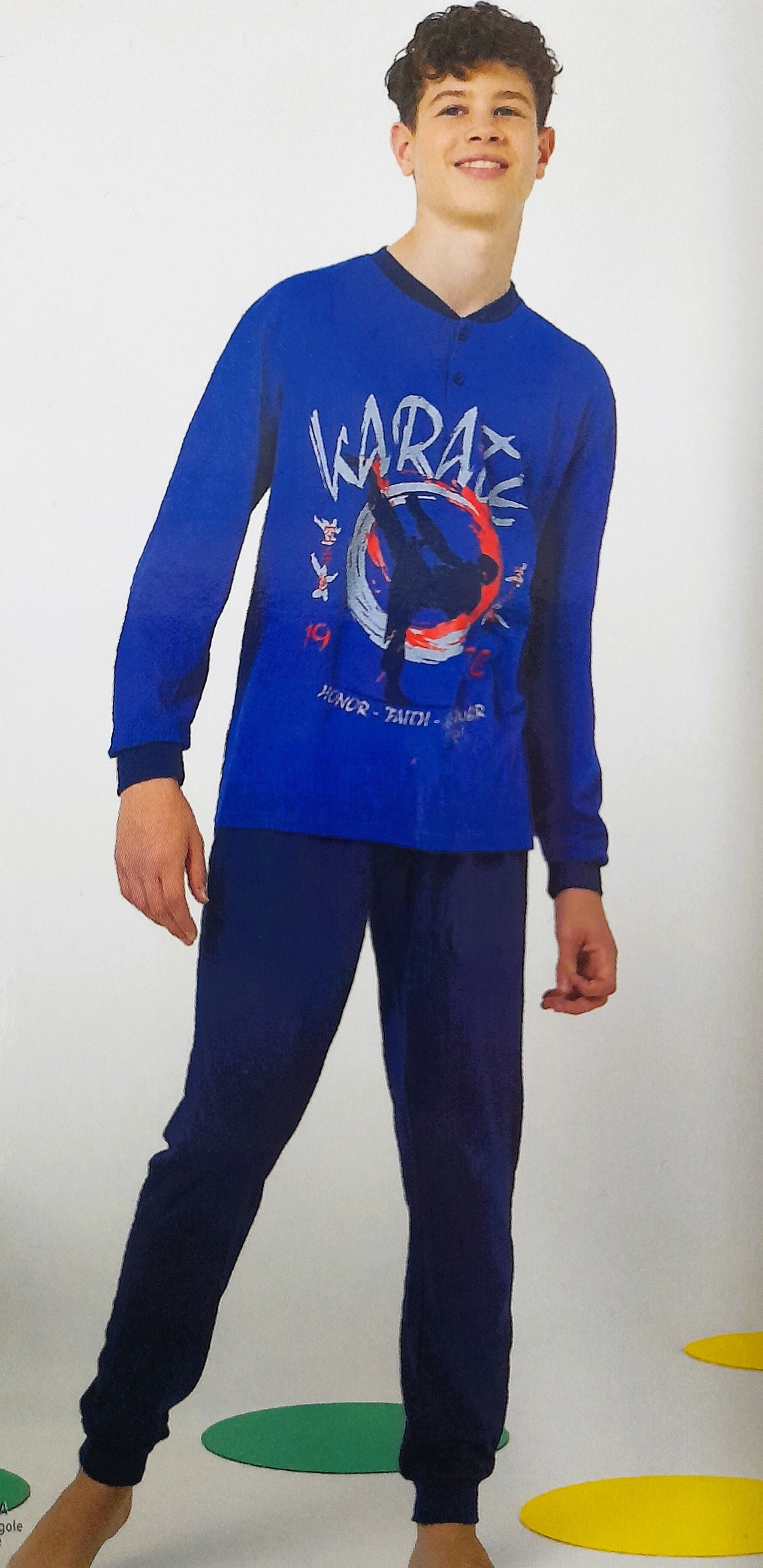 Questo Pigiama lungo con stampa karate da ragazzo è la scelta perfetta per chi cerca comodità e stile anche nei momenti di relax . la maglia a maniche lunghe è decorata con una stampa sportiva ispirata al karate, ideale per i giovani che amano le arti marziali.